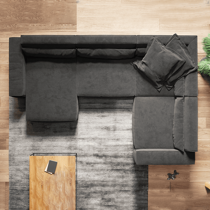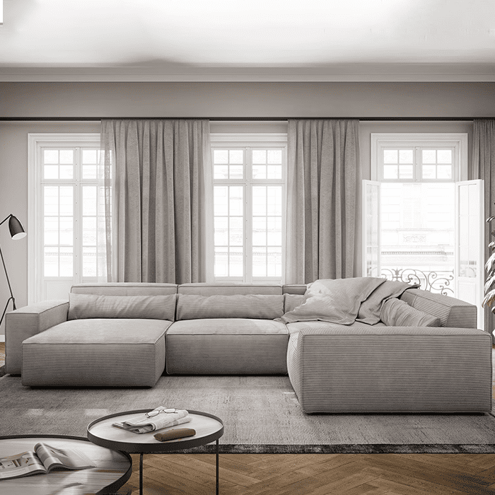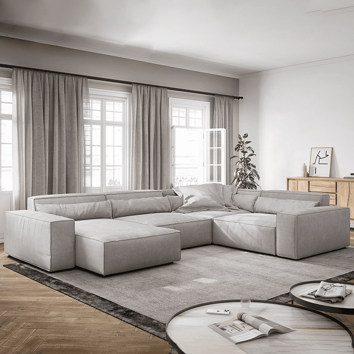 The Corduroy Fabric Sectional Sofa is simply inimitable in terms of aesthetics and comfort. The timeless design with its low, cubic shapes fits tastefully into all modern furnishing styles. Ennobled with sophisticated piping, this imposing lounge creates an elegant ambience. It is modular and can even be positioned freely in the room thanks to its back-friendly upholstery. A particularly deep seat and padded backrests make sitting and lying down a unique moment of relaxation.