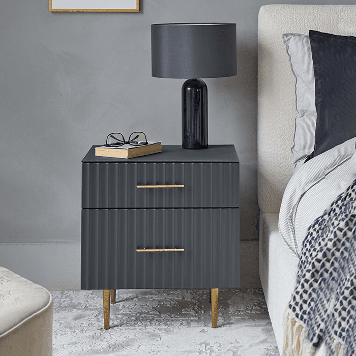 Meet the dark grey 2 drawer bedside table, a stylish and functional option for your bedroom. The fluted detailing and brass accents will bring elegance, while the 2 drawers offer plenty of storage. The tempered frosted glass top ensures durability, making it perfect for everyday use. With drawer liners, it will add a little touch of luxury to your space. Whether you are storing night-time essentials or displaying a chic lamp, the bedside table seamlessly blends functionality with timeless design.