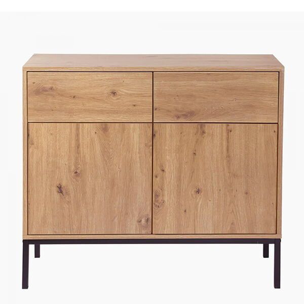 Discover our Oak Drawers with 2 Cabinets, with a compact size and contemporary style to store your belongings while bringing a touch of decoration to your interior. Main material:  certified MDF, from sustainably managed forests. Ideal as a small buffet-style storage unit in a living room or as a chest of drawers in a bedroom. Furniture made of particle board with black metal base.