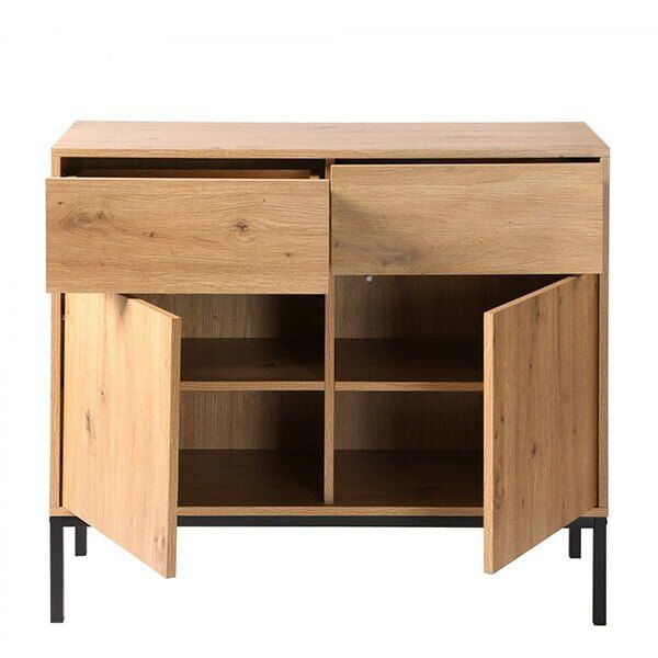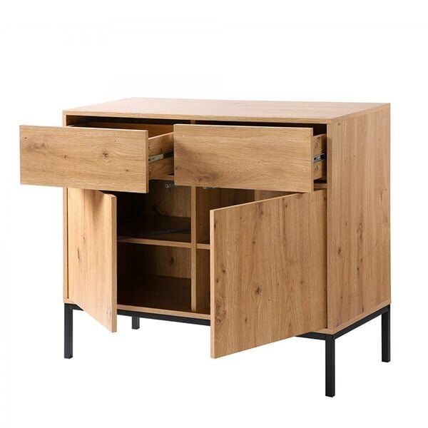 Discover our Oak Drawers with 2 Cabinets, with a compact size and contemporary style to store your belongings while bringing a touch of decoration to your interior. Main material: certified MDF, from sustainably managed forests. Ideal as a small buffet-style storage unit in a living room or as a chest of drawers in a bedroom. Furniture made of particle board with black metal base.