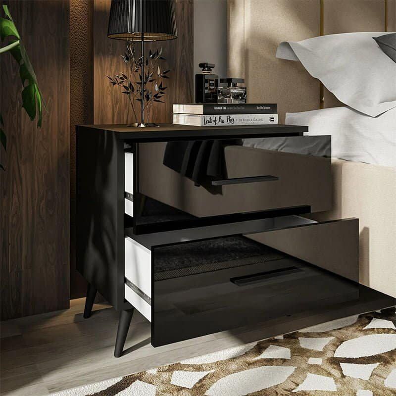 The Glossy Black Bed Side Table is a great way to use the available space in the bedroom. This practical piece of furniture fits easily between the bed and the wall and offers you additional storage space for small items that you need during the night. The Black Nightstand has two spacious drawers, so you have plenty of space for your belongings. The drawers are equipped with ball-bearing guides so that you can use the drawers freely.