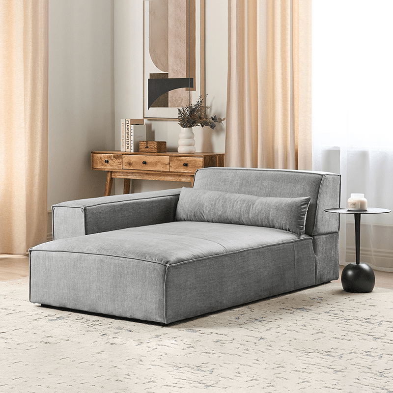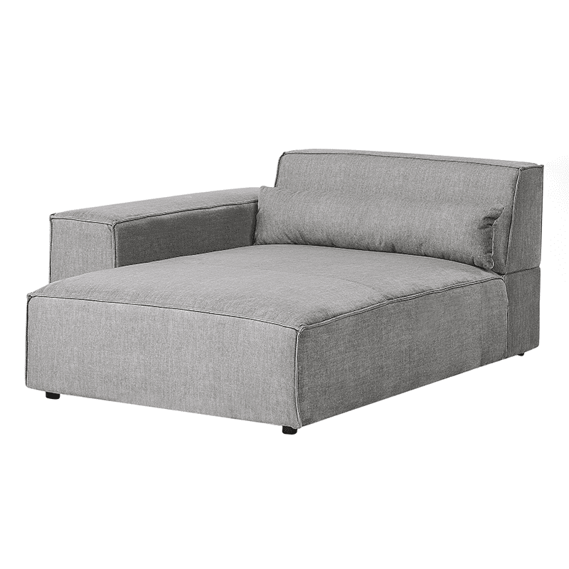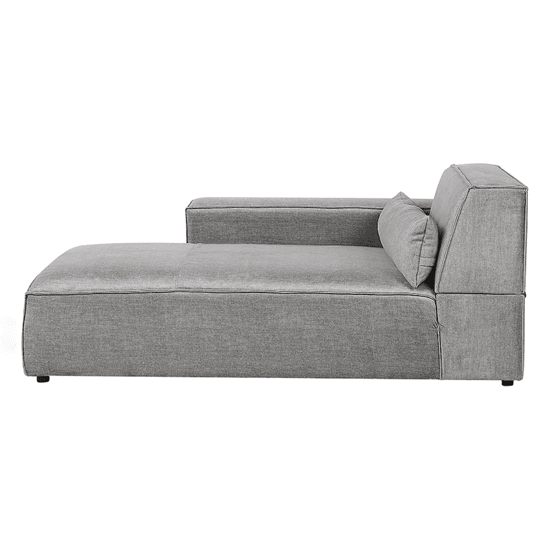 Bring comfort to your home with this minimalist gray fabric chaise lounge. With its clean lines and a seat filled with thick foam, it offers unparalleled comfort. The included long scatter cushion provides extra support for the lower back area. Draped in a smooth fabric upholstery, the piece gives off a modern look with a touch of elegance. The chaise functions as a standalone seat and seamlessly complements larger arrangements when combined with other pieces from the same collection.