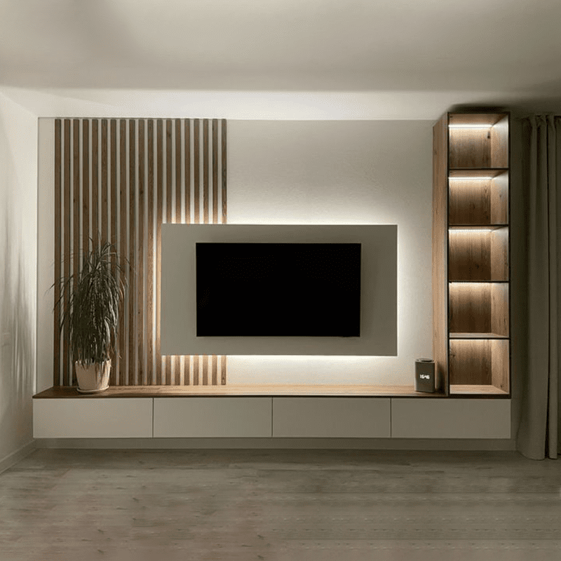 Adding a back panel: As shown in the image, a decorative back panel (like the vertical wooden slats) can add visual interest and help to define the TV area.
