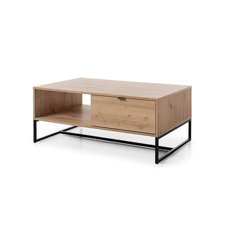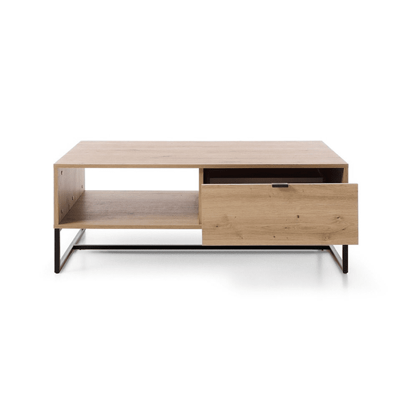Nova Coffee Table in Natural Oak. With a beautiful natural finish and modern industrial black leg frame, the Nova unit is the perfect blend of chic and cosy living. One spacious compartment and one drawer for all your media essentials. A perfect addition with a rustic touch to your living room.