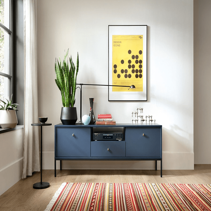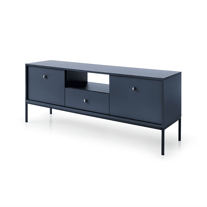 Oslo TV Stand in navy blue. Perfectly designed stand with lots of storage space. Three columns of drawers to keep all of your media essentials. With a beautiful dark finish, the Oslo media unit is the perfect blend of Scandi chic and cosy living. Ideal focus point for your living room.