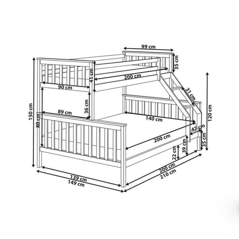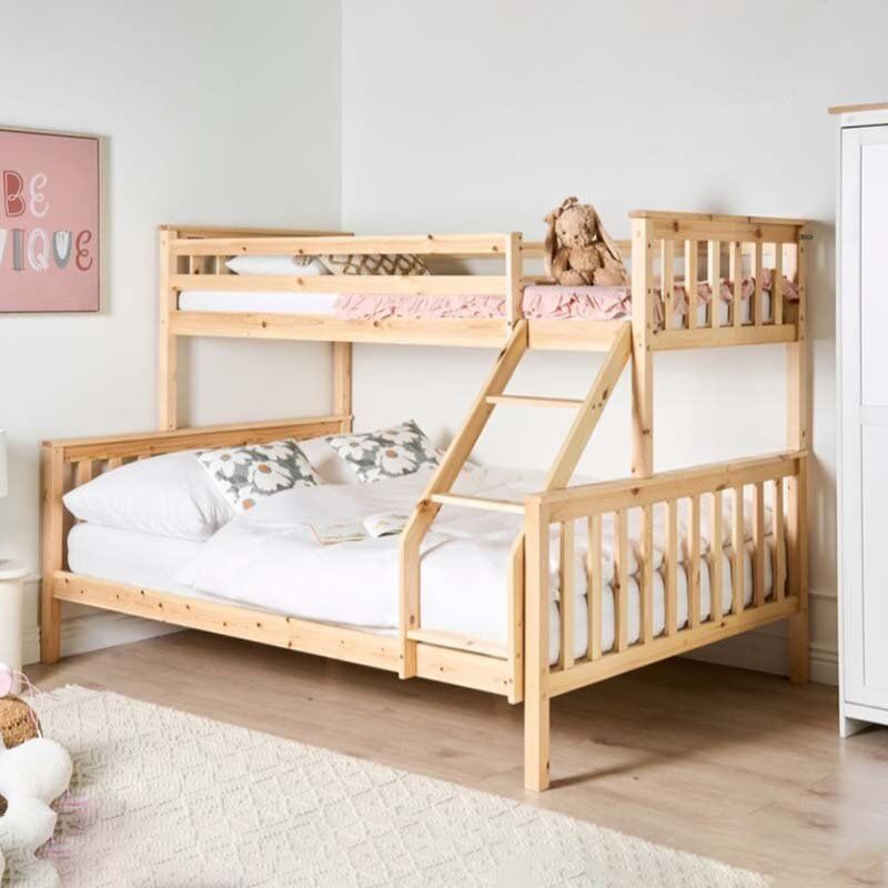 This space-saving single-over-double bunk bed is an ideal solution for families or rooms with limited space. The top bunk is a single bed, while the bottom bunk provides a comfortable double bed, making it perfect for up to three people. Crafted from Melamine MDF wood, it combines natural charm with lasting durability, bringing warmth and practicality to any bedroom. The clean, minimalist design fits seamlessly into a variety of interiors, while the angled ladder ensures easy and safe access to the upper bunk.