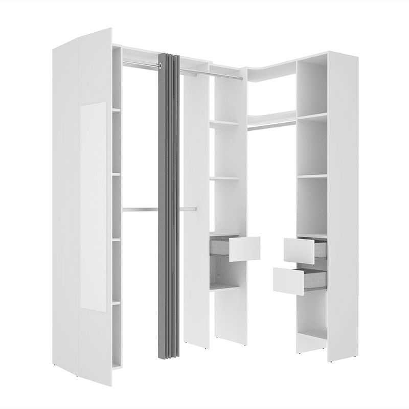 Storing and keeping your clothes away from dust will no longer be a problem with the White Corner Wardrobe! With its 3 columns of linen, 3 wardrobes and 3 drawers, this corner dressing room will offer you a large storage space. Thanks to a simple and elegant design, it will be the ideal dressing room to keep your looks well organized.